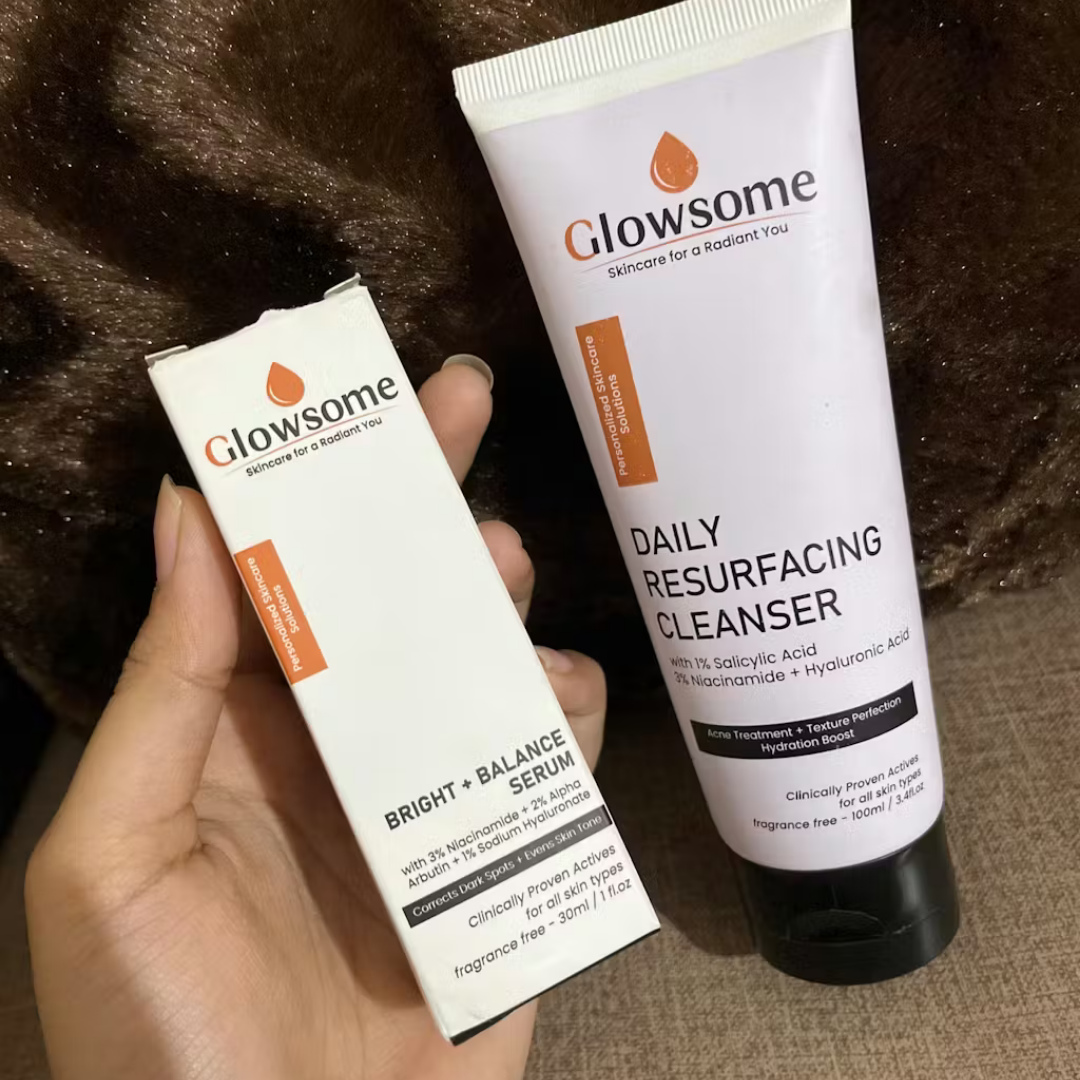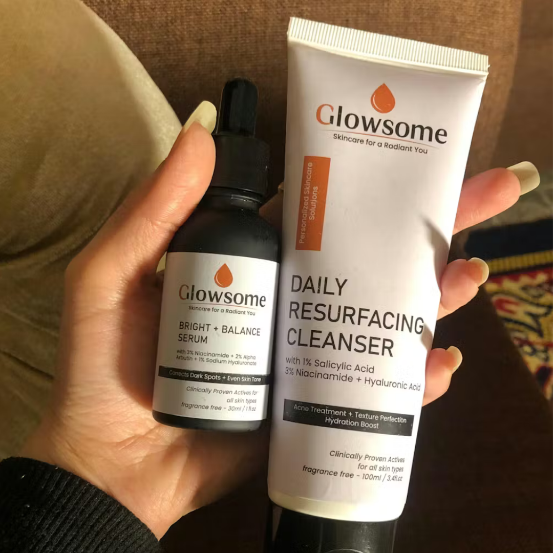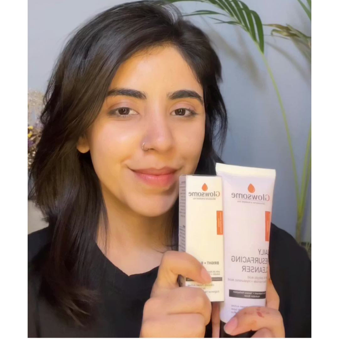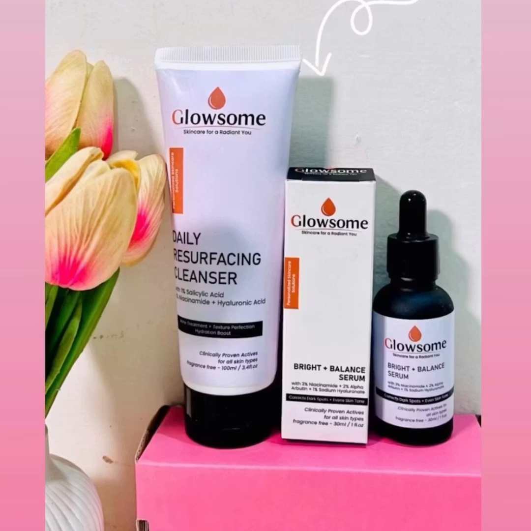 Glowsome ky products ky itny amazing results hai resurfacing cleanser skin ko itna smooth kr dta hai aik wash me he black heads clear kr dta or bright balance serum isky sath me use kr rhi Hu mjhy mri skin py achy results mil highly recommend for my side 🌸