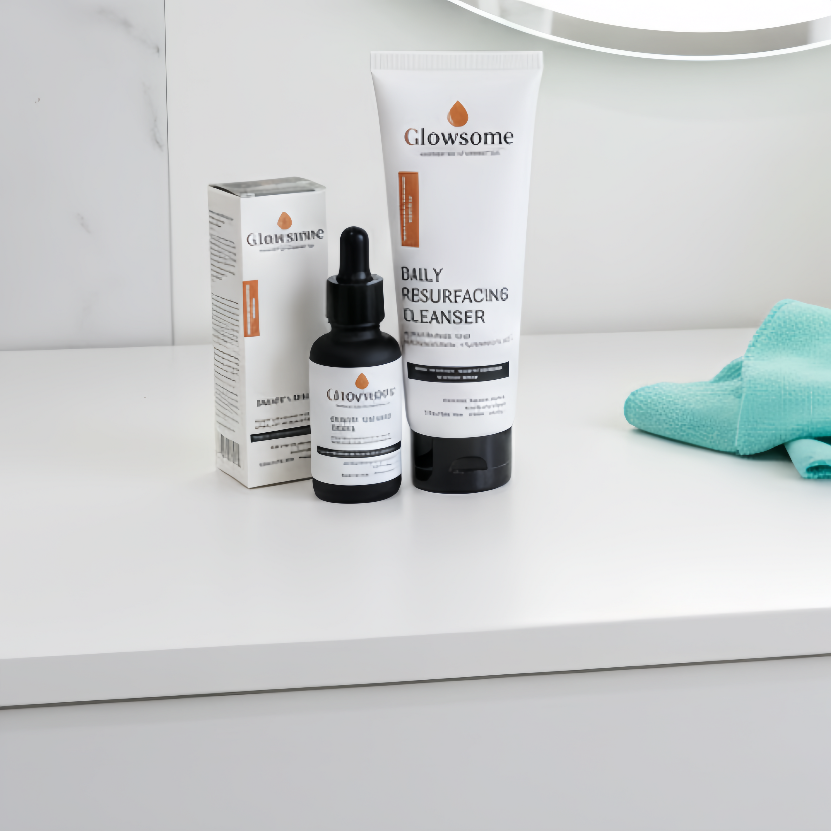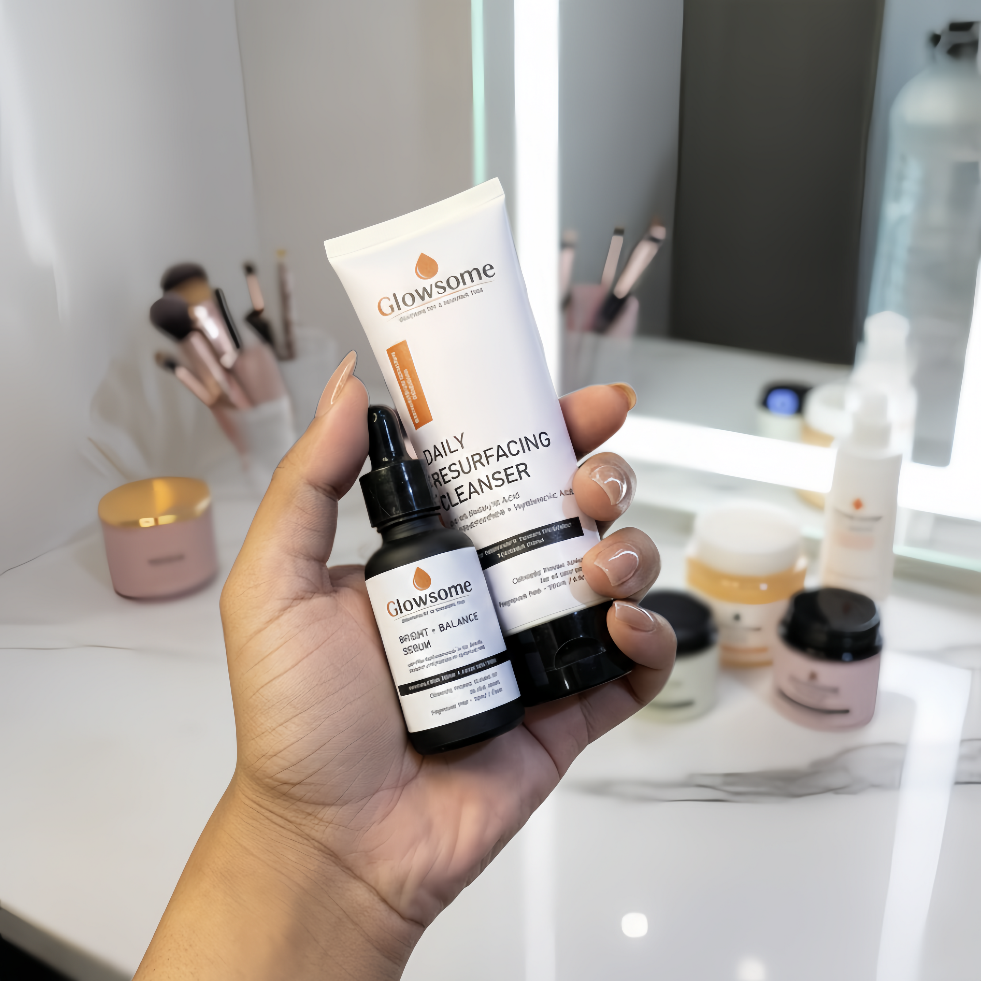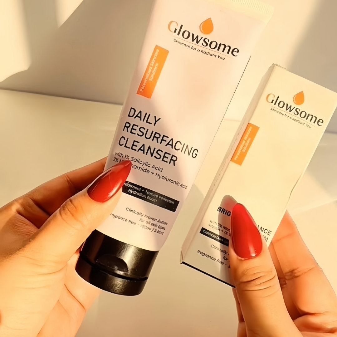 Glowsome ky products ky itny amazing results hai resurfacing cleanser skin ko itna smooth kr dta hai aik wash me he black heads clear kr dta or bright balance serum isky sath me use kr rhi Hu mjhy mri skin py achy results mil highly recommend for my side 🌸