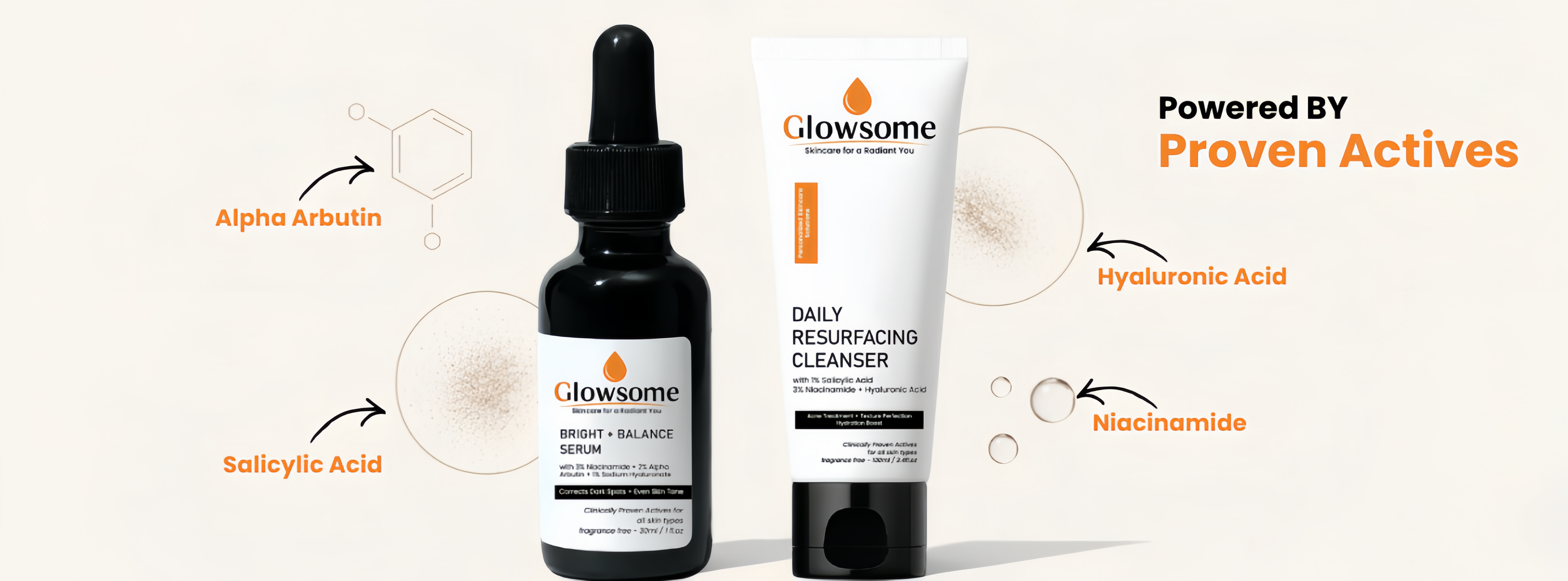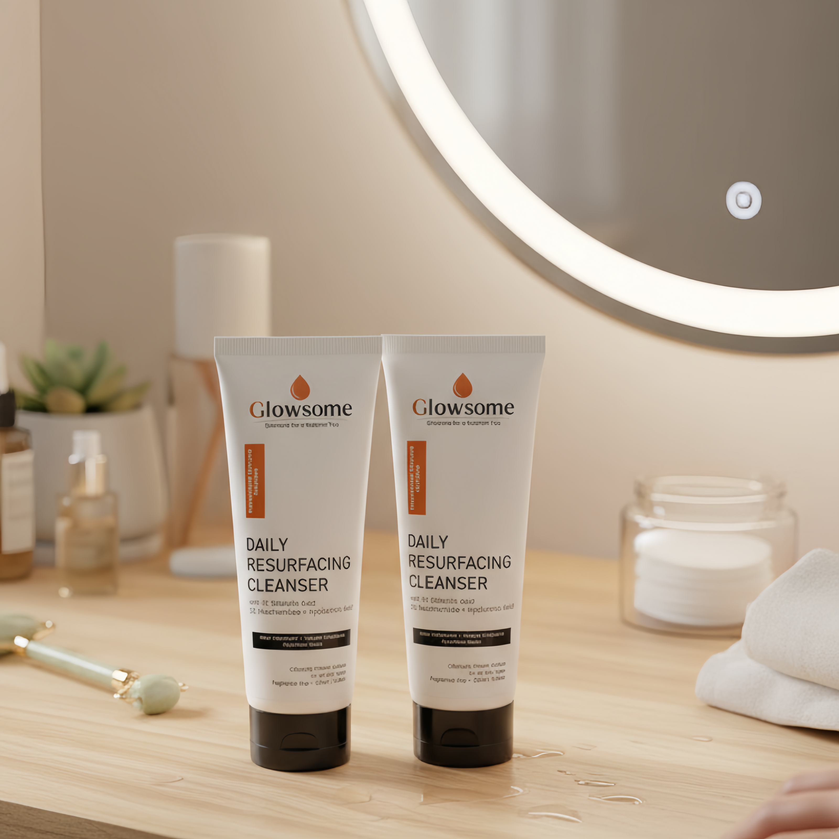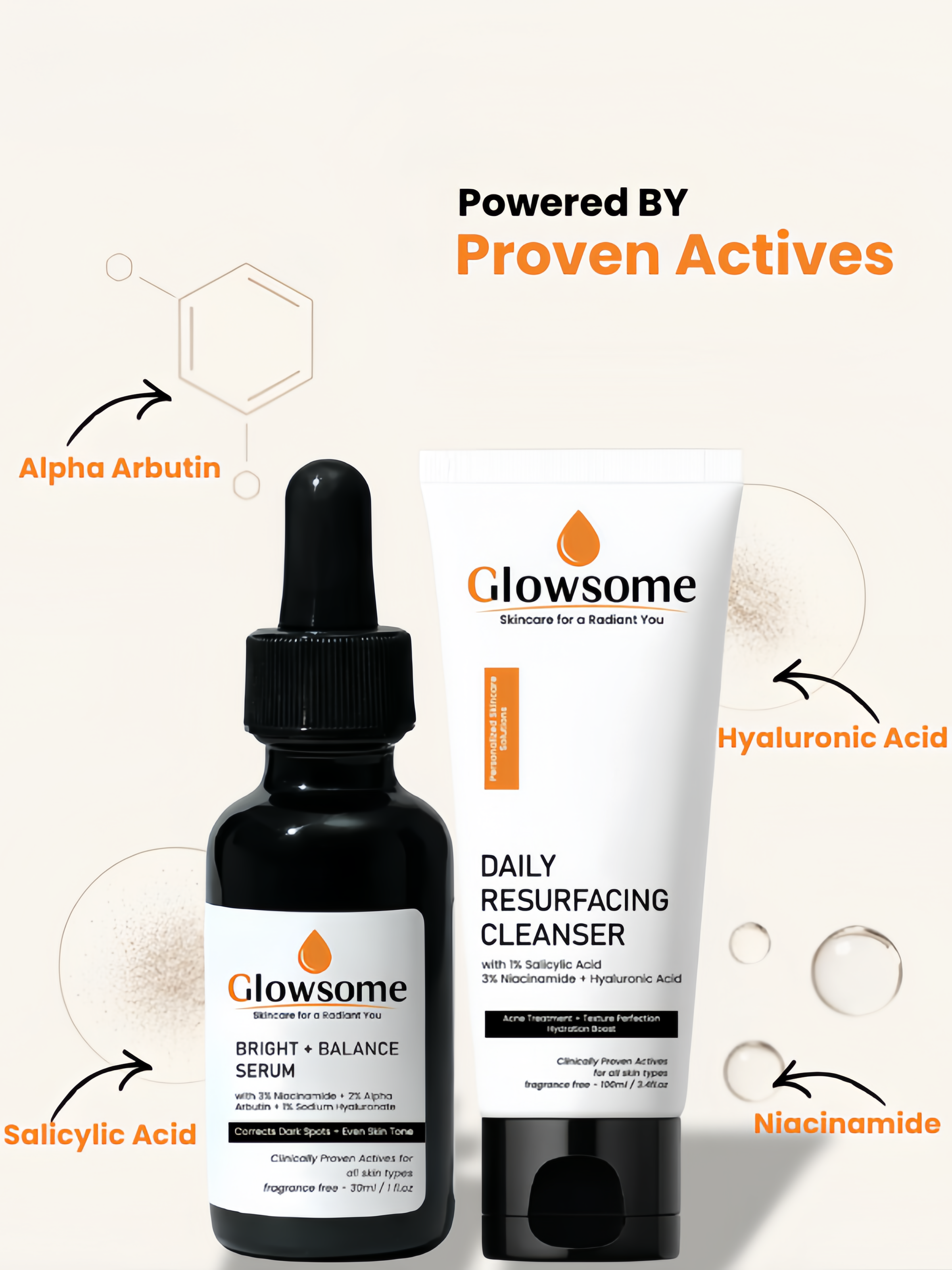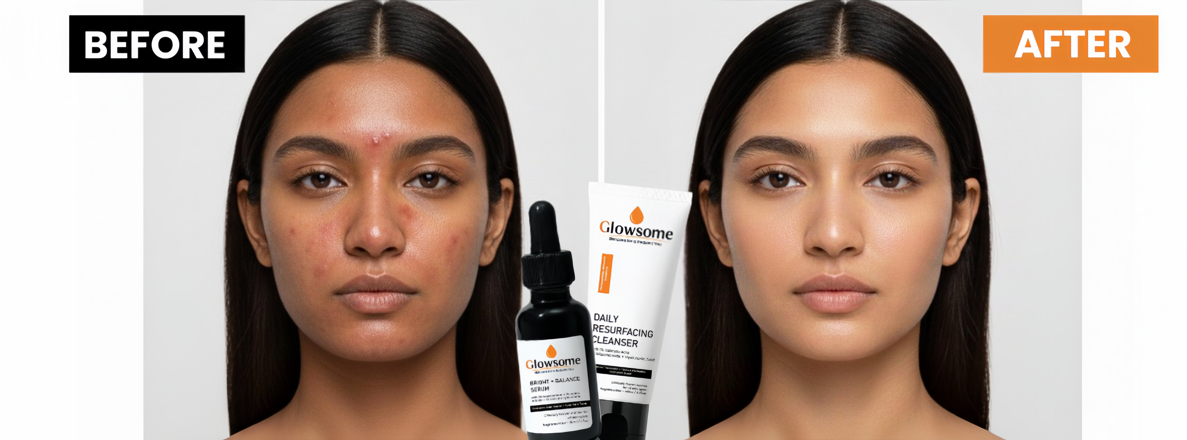 Glowsome ky products ky itny amazing results hai resurfacing cleanser skin ko itna smooth kr dta hai aik wash me he black heads clear kr dta or bright balance serum isky sath me use kr rhi Hu mjhy mri skin py achy results mil highly recommend for my side 🌸